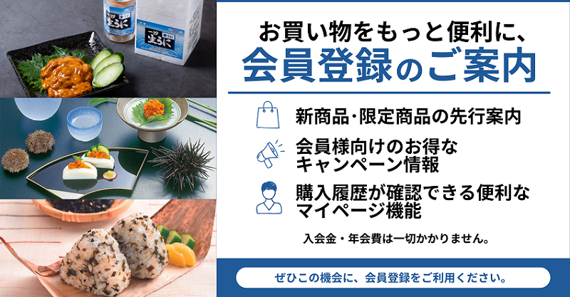 ※今後、会員様向けサービスを順次拡充していく予定です。 登録はかんたん・無料 入会金・年会費は一切かかりません。 ぜひこの機会にご登録いただき、 中嶋商店海産部のお買い物をより身近にお楽しみください。 |